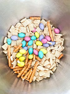 1. Mix Chex, pretzels, and chocolate candies in large mixing bowl