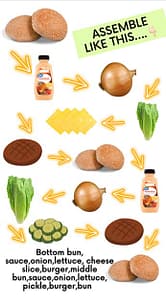 - Assemble like this: bottom bun, sauce, onion, shredded lettuce, cheese slice, burger, middle bun, sauce, onion, lettuce, pickle, burger, top burger