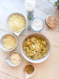 - I only use enough LITE Mayo to bring the dish together and no more. I think the recipe calls for 1/2 a cup, and I measure that out….but then I just add it by the TBSP till it becomes the consistency I like to hold it together…but the CHEESE will do most of the hard work
