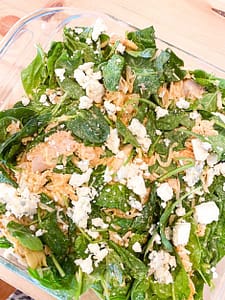 - Add all remaining ingredients to shredded chicken bowl OTHER THAN the spinach and the blue cheese. Mix well till all combined