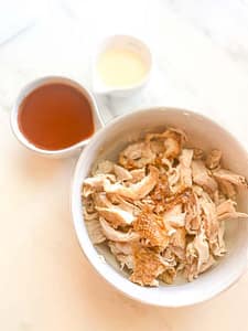 - Shred up one breast and one leg quarter of rotisserie chicken in a bowl