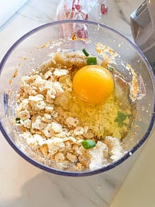 - Add chopped green onions, one package crackers (or 6-8 loose crackers), and one egg to shrimp mixture.