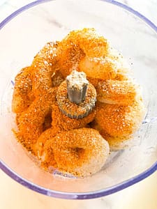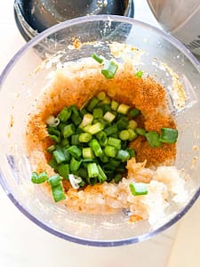 - Add your thawed, peeled, and deveined shrimp to your blender/food processor with your seasoning, 2 cloves garlic, and pulse for about 20 seconds until there are no large pieces.