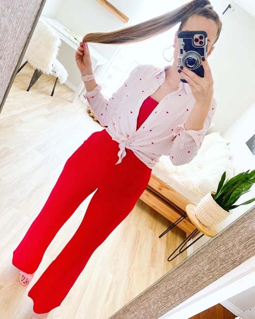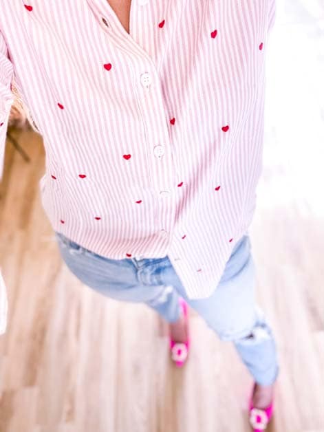 I am SO GLADDDDD this heart print top was released again this year (with a VERY minor ruffle collar switcharoo). I currently own this top in multiple colors/prints and sizes….4 others to be exact. This is hands down one of my favorite shirts. Even if I hadn’t found it for $17…. it would still be one of my favorites. I picked this top up to style it for Valentine’s Day last year, but I will 100% be wearing it year-round. I’m just one of those people. I love heart print everything. I really wish I didn’t…..buuut I do! When Lady Gaga got engaged with a GIANT heart-shaped engagement ring and everyone was like ewwwww, David. I was like ohhhhhhh. So here are a few different ways to style this heart print button-down…(or is it button-up ???!!!) for Valentine’s Day or any day in between.