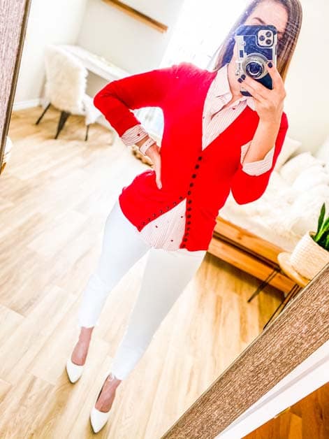 - Throw a red cardigan over look number 3 with white heels and CALL IT A DAY!